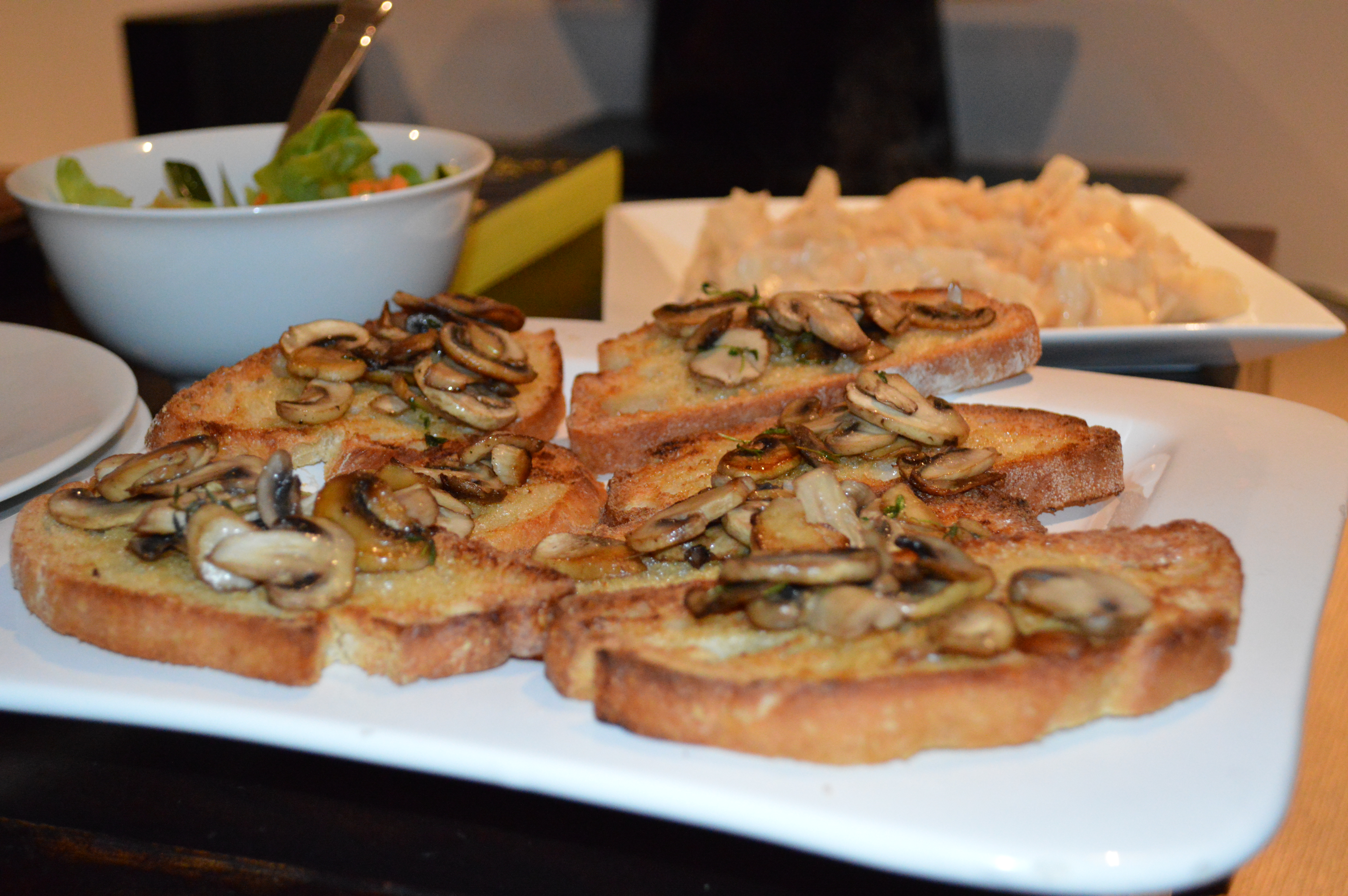 I used italian pane de casa bread rolls brushed with a mixture of olive oil, butter, garlic and lemon juice lightly oven grilled until golden. Tomatoes were particularly flavoursome this week and I always enjoy making oven roasted tomatoes as they are so versatile – on bruschetta, pasta or as an accompaniment to schnitzel or meat dishes, oven roasted tomatoes make an easy but high impact statement to a meal. These roma tomatoes have been halved and placed on baking paper with a splash of olive oil, balsamic vinegar and few grinds of rock salt(diced shallots are optional). They are then roasted in a slow oven for about 30 mins or until they start to look soft & caramelised. The mushrooms are cooked at a high heat in a cast iron pan(cast iron is my favourite for pan cooking)with a little olive oil. I wait until they are almost cooked and then add some rock salt, squeeze or two of fresh lemon juice and a small handful of lemon thyme from the herb pot. The trick is to slightly squash the tomato onto the bruschetta just before eating so it doesn’t all fall off as you put into your mouth, as well as strategically placing the mushroom pieces so they look good.