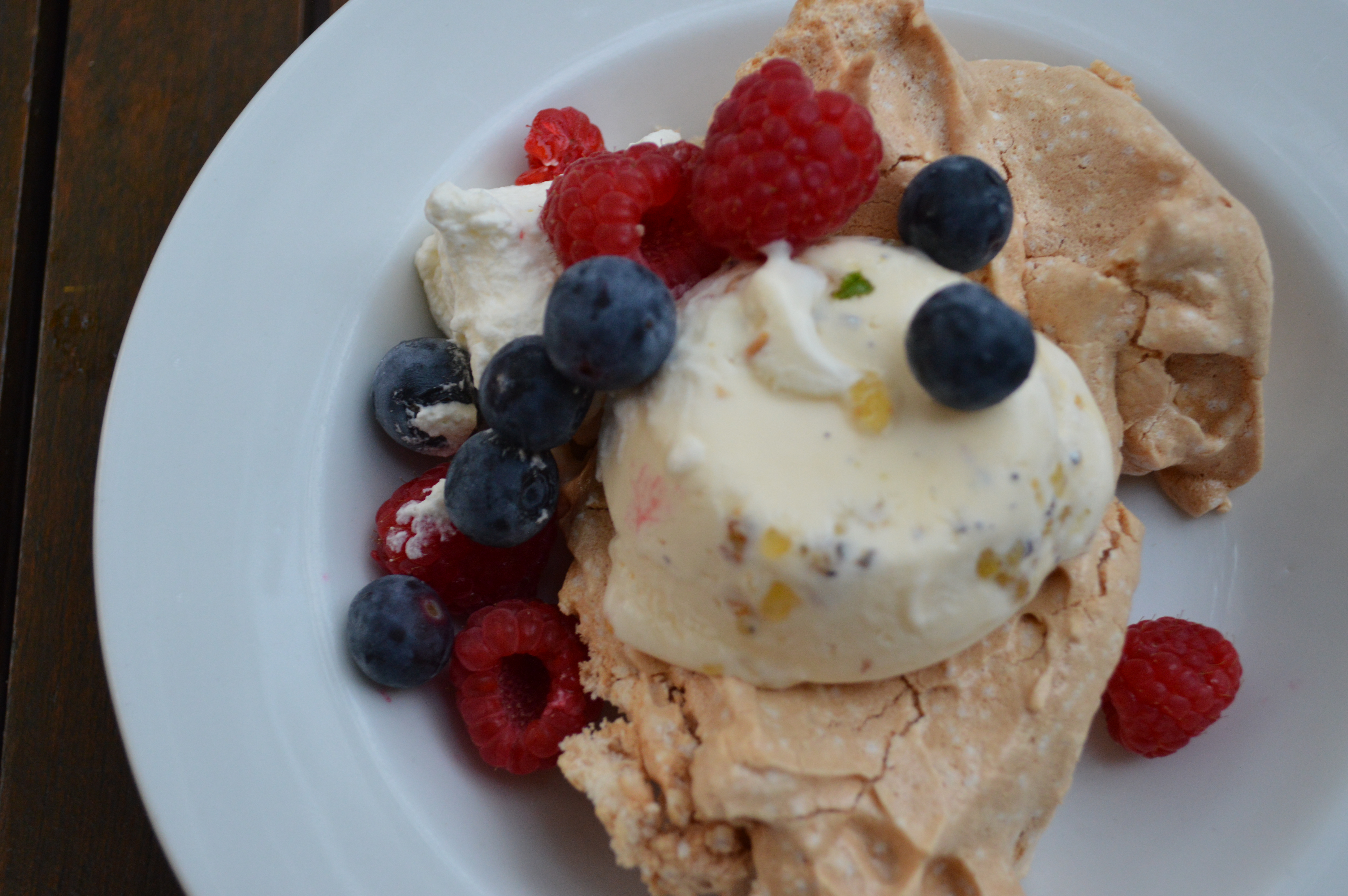 For the plating up (oh that sounds so much more pro than the word ‘serving’. Thank you Masterchef) – Meringues decorated with some fresh cream and fruit and the praline ice-creams set on the top.